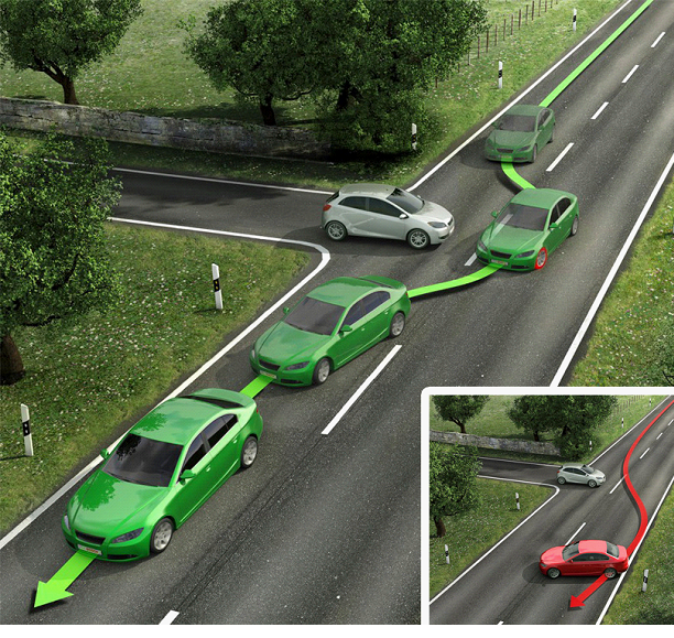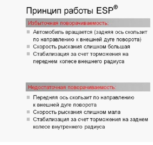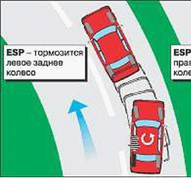 В том случае, если на повороте передние колеса заносят в сторону, система курсовой устойчивости esp исправляет ситуацию путем замедления того колеса, которое находится на внутреннем радиусе. Иногда возникает обратная ситуация, когда заносит заднюю часть авто, тогда включаются передние тормоза и тормозится колесо, расположенное снаружи.