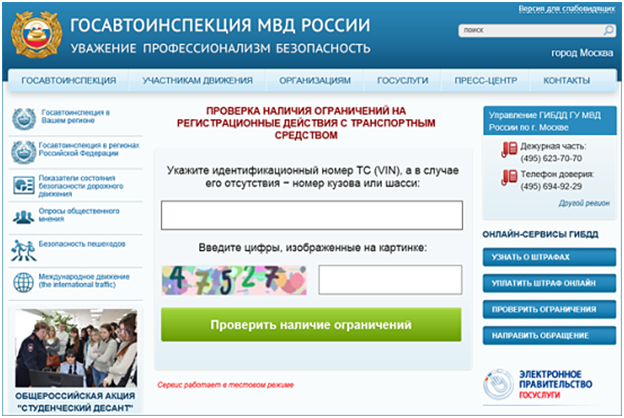 На официальном сайте ГИБДД необходимо зайти в раздел «Проверка ограничений». В появившееся окно вводится VIN- код авто или номер кузова, затем необходимо следовать дальнейшим указаниям.