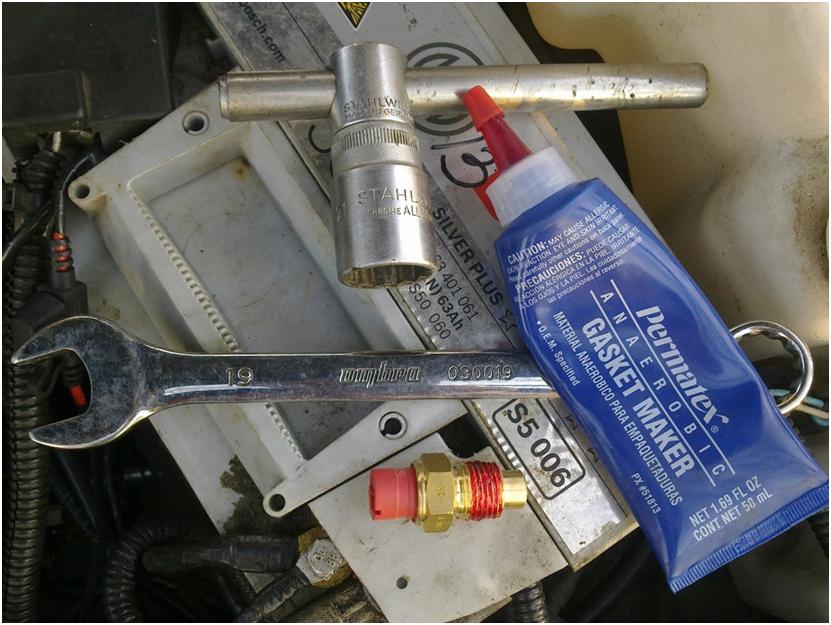 Датчик температуры двигателя вывинчивается из установочного отверстия с помощью накидного ключа или головки на 19 с трещоткой. На время ремонта отверстие в термостате следует закрыть ветошью или заглушкой, чтобы избежать попадания посторонних частиц в систему охлаждения.