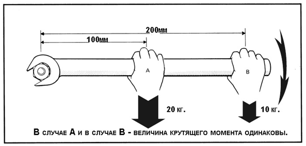 Крутящий момент — это сила, которая производится на конце рычага, относительно оси вращения этого рычага. Иначе говоря, величина крутящего момента показывает сколько килограмм, закреплённых на конце, способен удержать рычаг. Если грубо: крутящий момент 100 Н*м означает, что если на конец рычага длинной 1 метр, находящийся параллельно к земле повесить груз массой 10 кг, рычаг не будет вращаться ни вверх ни вниз. Груз создаёт вращающий момент, а рычаг с его же помощью сопротивляется. Они друг друга уравновешивают.
