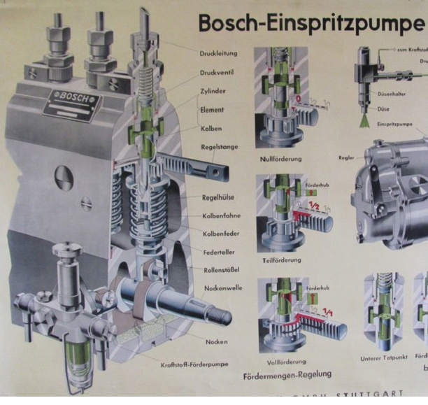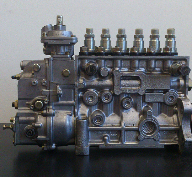 Первые образцы были построены по этому типу. Насос представляет собой маленькую копию двигателя: он рядный, V-образной конструкции. Имеет коленчатый вал, который соединен с двигателем и крутится с ним на одной частоте. Коленвал ударяет по топливным магистралям, которые выдают горючее в свои форсунки. Это не самая эффективная схема, так как механическая форсунка не дает капли топлива минимального размера.