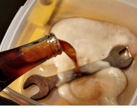 Убрать ржавчину с металла можно обычными газированными напитками. Чаще всего для этого используется Coca-Cola. Дело в том, что в ней содержится фосфорная кислота, которая отлично справляется с коррозией. Если проблема серьезная, рекомендуется замочить металл в ванночке с газировкой. Если нужно убрать налет, то в напитке смачивают губку для мытья посуды или шарик из фольги. Ржа легко оттирается этими предметами.