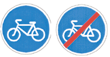 Знак «велосипедная дорожка» (4.4.1) разрешает передвигаться на велосипедах, а также позволяет передвигаться по дорожке пешком, если нет тротуара. Также существует «конец велосипедной дорожки» (4.4.2), который обозначает окончание функционирования предписаний.