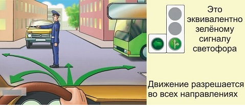 - В некоторых случаях полицейский подает сигналы, разрешающие ехать с двух сторон перекрестка.