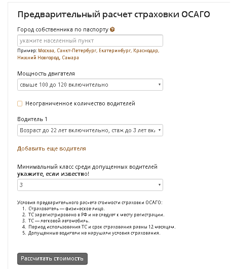 Перед тем, как оформить ОСАГО по интернету, следует понять, сколько необходимо заплатить для получения полиса. Возможности интернет-ресурсов избавляют пользователей от необходимости проведения самостоятельных расчётов. Для этого можно воспользоваться онлайн-калькулятором, который проведёт расчёты в автоматическом режиме после ввода желаемых параметров страховки ОСАГО по интернету, а также характеристик водителя и его машины.