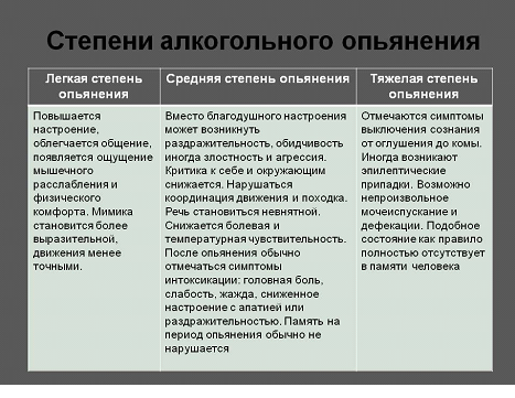 Рефлексы нарушаются, речь становится непонятной. У мужчин наступает частичная импотенция. Наблюдается эффект куриной слепоты, могут быть приступы страха или гнева. 1 промилле это сколько? Считается, что при таком показателе в 1л крови содержится 1 гр. этанола.