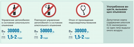 Новый закон подкорректировал не только сколько промилле допустимо, но и ввел новые штрафные санкции. За управление ТС в пьяном виде можно не только выложить до 50 тыс. руб., но и остаться без документов.
