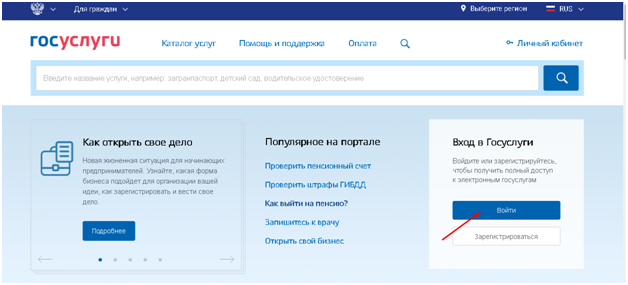 - Осуществить вход в сервис, нажав на кнопку «Войти», если гражданин уже пользовался порталом и регистрировался в нем.
