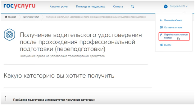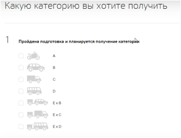 - Выбрать категорию автомобиля, на который оформляются госуслуги на получение прав.