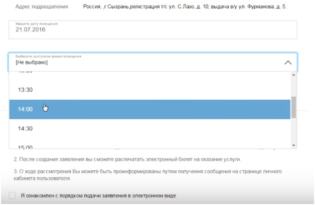 - Ознакомиться с порядком подачи заявления в электронном виде, поставив «галочку» в специальном поле.