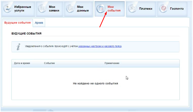 - В разделе «мои события» будут отражены сведения о завершении регистрационных действиях, данных платёжного документа и планируемой дате и времени события.