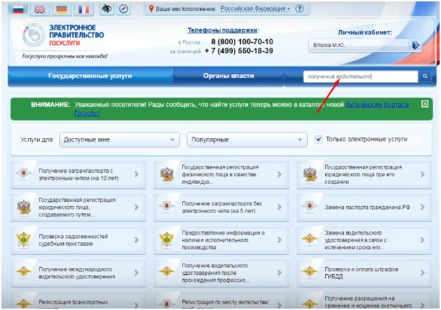 - В строке поиска услуг ввести запрос: «Зарегистрироваться для получения водительских прав».