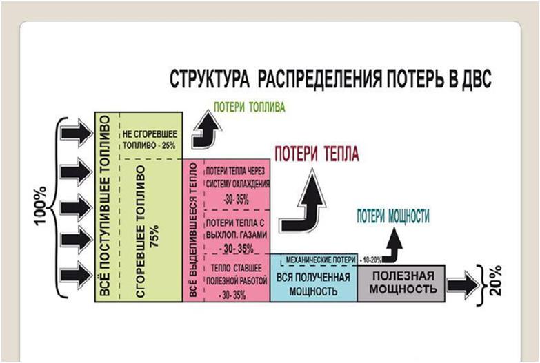 - тепловая – двигатель греет не только себя, но и другие его элементы. Для получения тепла требуется энергия, это и есть потери. На них тратится еще 35%;