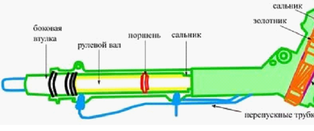 Это упрощенная схема устройства, которая необходима для понимания принципа работы. На самом деле рулевая рейка состоит из регулирующих элементов: пружины, втулки, ограничители.
