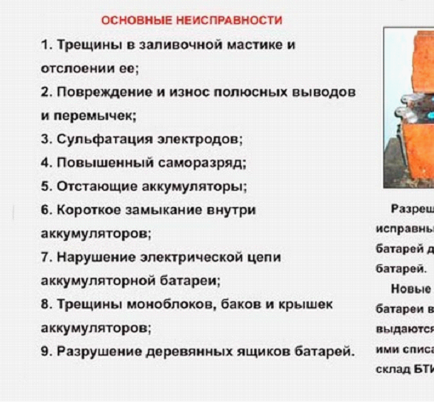 - сульфатизация пластин – появляется при длительном хранении. При этом наблюдается высокая плотность, повышенная плотность электролита и происходит саморазряд;